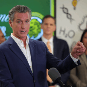 جافين نيوسوم، مرتديًا سترة رياضية زرقاء بدون ربطة عنق، يقف وهو يتحدث في ميكروفون ويشير بيده اليسرى. مجموعة من الأشخاص خلفه، خارج التركيز.