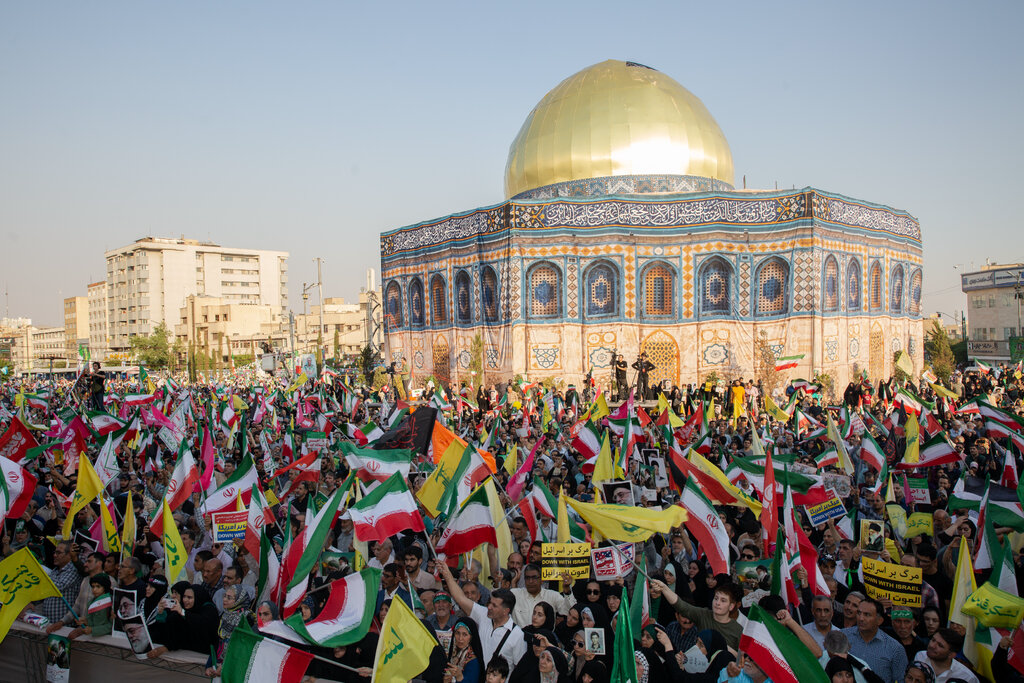 حشد كثيف يحمل العلم الإيراني وأعلامًا أخرى يحيط بهيكل ذو قبة ذهبية.
