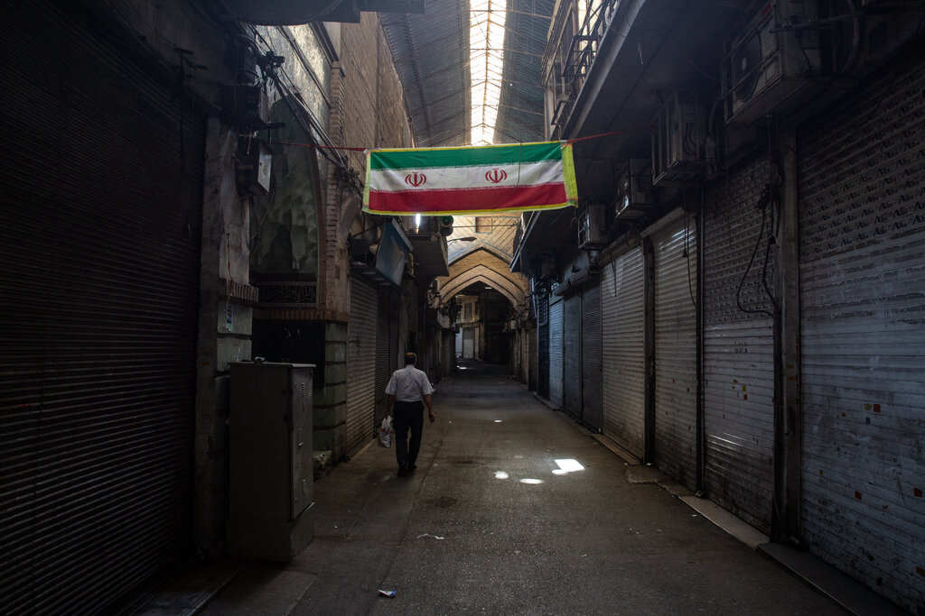 رجل يمشي في شوارع تسوق مغطاة، جميع متاجرها مغلقة. علم إيراني يتدلى فوق الشارع. أغلق بازار في طهران يوم الاثنين بعد أن هاجمت إسرائيل المدينة.