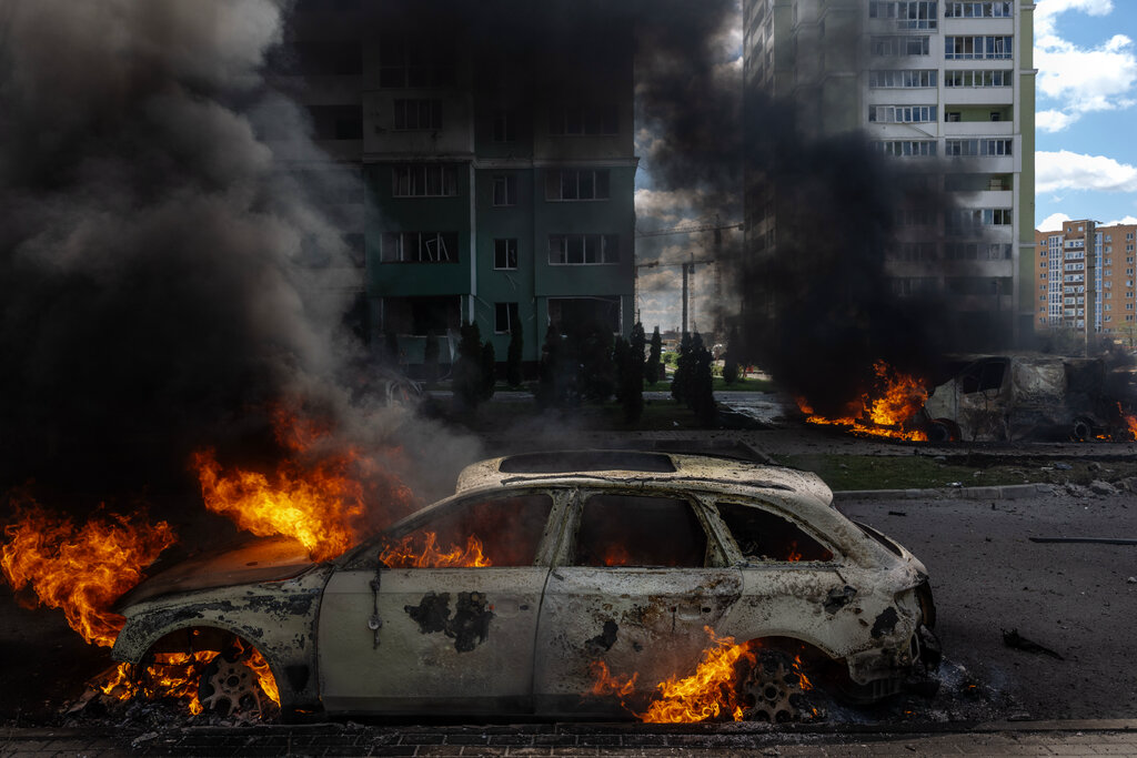 سيارات مشتعلة يتصاعد منها دخان أسود أمام مبانٍ سكنية.