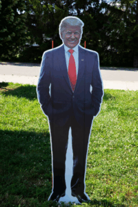 مجسم كرتوني للرئيس ترامب يجلس على عشب.