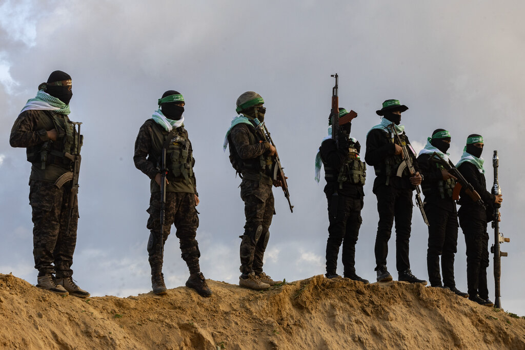 . صف من الأشخاص بالزي العسكري يحملون بنادق هجومية يقفون على تل ترابي. وجوههم مغطاة، وكل واحد منهم يضع عصابة خضراء على جبهته.