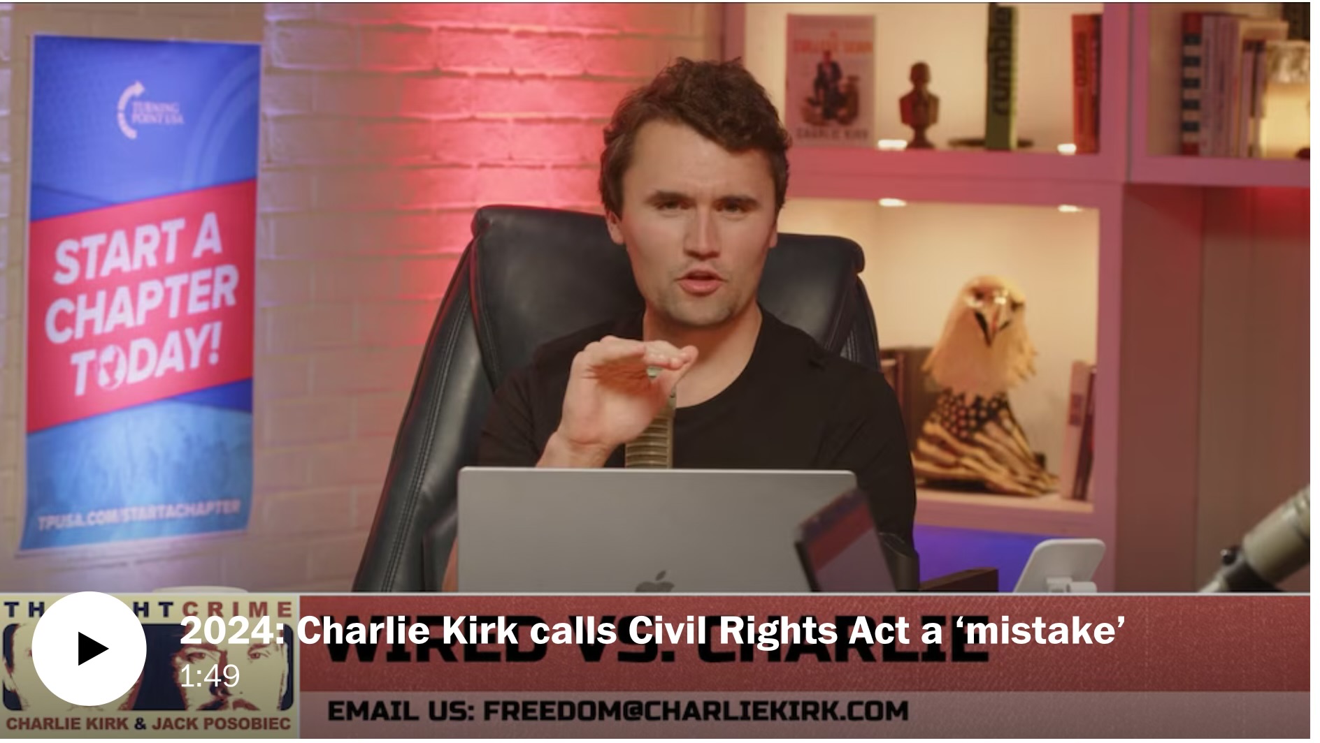 كما قام منتقدو كيرك بتقطيع خطاباته إلى مقتطفات صوتية، ونشروا أجزاءً قالوا إنها تروج لآراء هامشية أو خطيرة. فبعد أن اقتحم رجل منزل رئيسة مجلس النواب السابقة نانسي بيلوسي (ديمقراطية) في عام 2022 وضرب زوجها على رأسه بمطرقة، حث كيرك مستمعيه على دفع الكفالة للمهاجم. ووصف جورج فلويد بأنه “وضيع”، واعتبر تمرير قانون الحقوق المدنية التاريخي لعام 1964 “خطأً كبيراً”.