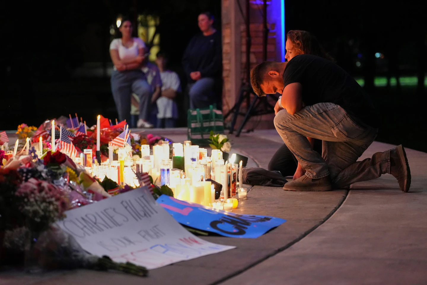رجل يركع أثناء وقفة حداد على كيرك يوم الخميس في أوريم، يوتا. (ليندسي واسون/أسوشيتد برس)