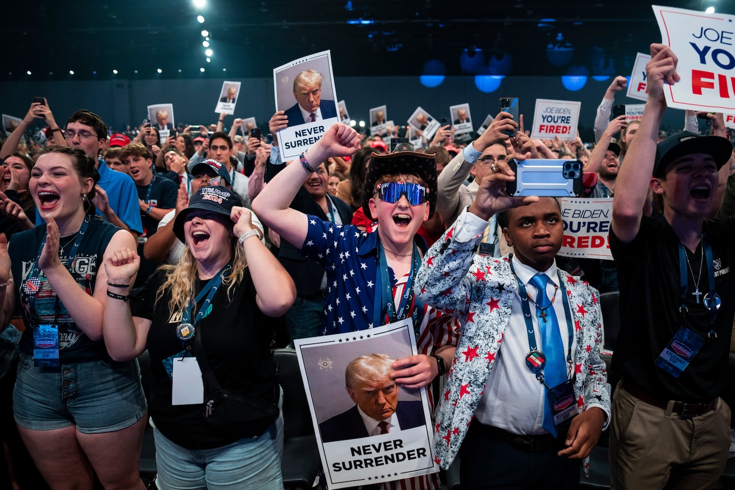يهتف المؤيدون بينما يتحدث الرئيس دونالد ترامب في مؤتمر “مؤتمر الشعب” التابع لـ Turning Point USA، عام 2024 في ديترويت. (جابين بوتسفورد/واشنطن بوست)