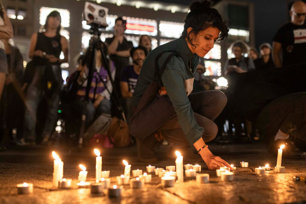 امرأة تضيف شمعة مضاءة إلى أخرى موضوعة في صف على الأرض. يقف أشخاص آخرون خلفها في الخلفية.