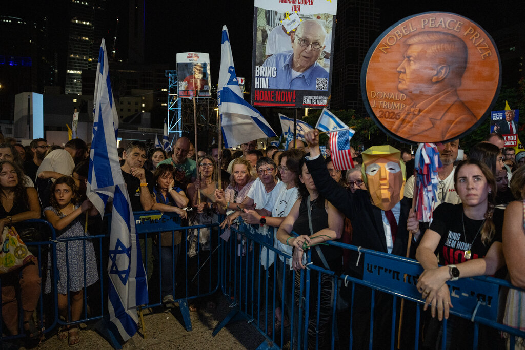 إسرائيليون مجتمعون في ساحة الرهائن في تل أبيب ليلة السبت، العديد منهم يشكرون الرئيس ترامب على وقف إطلاق النار الذي مهد الطريق للإفراج المتوقع عن بقية الرهائن. تصوير… ديفيد غوتنفلدر لنيويورك تايمز