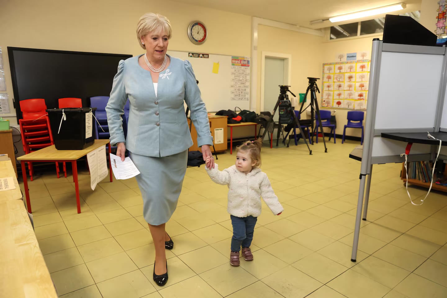 مرشحة حزب فاين غايل هيذر همفريز تدلي بصوتها يوم الجمعة بمساعدة حفيدتها شارلوت البالغة من العمر سنة واحدة في المدرسة الوطنية المركزية في كيليفان، مقاطعة موناغان. (ليام مكبورني/ وكالة با الإعلامية/ أسوشيتد برس)